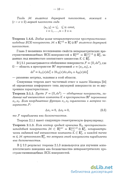 Х2 = ащ + Ьщ, Ь > О, такое, что если для & = 1,2,..., n + ?ч — 2 положить ft{ui,u2) = fk{ui,aui + bu2), то будут справедливы утверждения: u\,ii2 — изотермические координаты на Л4; fl(u\,U2) — гармонические функции; если положить и = щ + іщ, с = а — ib, Е Это утверждение является ключевым результатом первой главы. На его основе найдены аналоги теоремы Бернштейна для решений систем, описывающих непараметрические пространственноподобные НСК-поверхности над двумерными плоскостями различных типов. С геометрической точки зрения данные результаты выражаются следующими двумя утверждениями. Теорема 1.4.5. Предположим, что целая непараметрическая прост-ранственноподобная НСК-поверхностъ М. в Е"+г = E"j^-2 0 Е2 заключена внутри многогранного угла, определяемого неравенствами (а,-,х)>7»> і = 1,..., n-2 + z/, где 7f = const, а а,- Є Е"+г — постоянные векторы, ортогональные подпространству переменных у\,... ,yr-v, проекции которых на плоскость переменных уг~и+\,.. . ,г/п+г_2 линейно независимы. — 10 — Тогда Ai является двумерной плоскостью, лежащей в (г — и + 2)-мерной плоскости вида (а,-,Х>=7,'> Ъ = const, г = 1,..., п — 2 + v. Теорема 1.4.6. Любая целая непараметрическая пространственно-подобная НСК-поверхность М. в Е+2 = Е^фЕ2 является двумерной плоскостью. Пусть Тт.М — касательное пространство к Л4 в точке т. Обозначим через д первую фудаментальную форму поверхности ЛІ, индуцированную из Ej?+r, по формуле где X, Y Є ТтМ С ТШЕ"+Г — произвольная пара векторов. В евклидовом пространстве первая фундаментальная форма поверхности всегда невырождена и положительно определена, а значит является римановой метрикой. В псевдоевклидовом пространстве ситуация иная. Здесь первая фундаментальная форма поверхности может быть вырожденной — иметь ранг меньше чем к. Более того, возможно даже, что равенство будет выполнено для любых X, Y Е ТтЛ4. Вырождение может происходить как в отдельных точках, так и всюду на М. Договоримся, для краткости, называть поверхности со всюду вырожденной первой фундаментальной формой изотропными, а со всюду невырожденной, соответственно, неизотропными. Если поверхность М. неизотропна, то как и в евклидовом случае, мы будем говорить о метрике д поверхности М.. Данная метрика может быть как знакоопределена, так и индефинитна (псевдориманова). Всюду ниже, где идет речь о метрике поверхности М. С Е"+г, б)гдет подразумеваться именно эта метрика. В настоящем исследовании будут рассматриваться поверхности с положительно определенной метрикой. Мы будем называть их пространств еннопоЗобными. Замечание 1.1.1. Если в (п + г)-мерном линейном пространстве V введено псевдоевклидово скалярное произведение ()г сигнатуры (г, гс), то в V также можно определить псевдо евклидов о скалярное произведение (v)n сигнатуры (п,?1), по формуле Равенство (1.3) означает, что между пространствами Е"+г и Е +г существует линейный изоморфизм сохраняющий длины векторов, но меняющий знаки их скалярных квадратов на противоложные. При этом изоморфизме поверхностям с положительно (отрицательно) определенной метрикой одного пространства однозначно ставятся в соответствии поверхности с отрицательно (положительно) определенной метрикой другого пространства. Тем самым любой результат сформулированный для поверхностей с метриками одного знака можно соответствующим образом переформулировать для поверхностей с метриками другого знака. В частном случае, когда поверхно