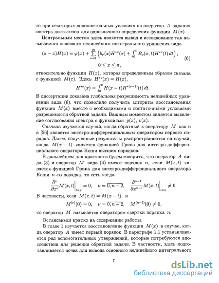 В главе 2 изучается восстановление функции М(х) в случае операторов высших порядков. Здесь важную роль играет теорема Л.А. Сахновича [58] об извлечении корня из оператора. Она, в частности, позволяет использовать результаты первой главы. Параграф 2.1 посвящен случаю п — 2, для которого получены результаты аналогичные тем, что имеют место для первого порядка. В параграфе 2.2 рассмотрен сушественно более сложный случай п 2, когда сформулировать необходимые и достаточные условия в терминах асимптотики спектра не представляется возможным. Здесь также получена теорема единственности и алгоритм решения обратной задачи вместе с необходимыми и достаточными условиями ее разрешимости. Последние даются в терминах характеристической функции. Отметим, что для вывода уравнения (6) существенными оказываются диффе-ренцируемость функций д(х), v(x) и условие