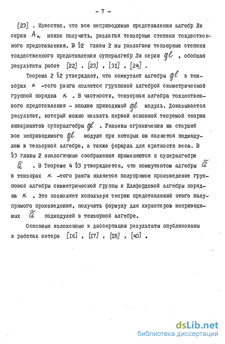 Вторая глава посвящена описанию конкретных моделей неприводимых представлений в пространстве тензоров и их применениям. Первый параграф содержит необходимый подготовительный материал, в частности, конструкцию представления симметрической группы в тензорном пространстве, теорию проективных представлений симметрической группы и т.д',; Эти результаты объясняют в частности использование диаграмм Юнга для описания подпредставлении супергруппы QL и других в тензорной алгебре как это сделано в [22j , [23] . Известно, что все неприводимые представления алгебр Ли серии п К/ можно получить, разлагая тензорные степени тождественного представления. В 2 главы 2 мы разлагаем тензорные степени тождественного представления супералгебр Ли серии (ЯО , обобщая результаты работ [22] , |23] , [зі] , [24] .