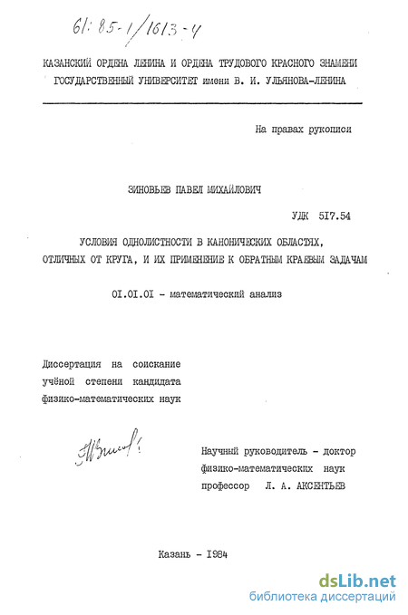 aПункты I) и 2) являются предельными случаями при к — оо пунктов I) и 2) теоремы 31. Для обоснования однолистности функции 2() в Н при выполнении условия 3) заметим, что р (%) -Яг [z"()/2 (z)\ и, как при доказательстве пункта 3) теоремы 31, найдём, что Применяя пункт I) следствия 4, получим требуемое утверждение. Подобным же образом с привлечением пункта 2) следствия 6 доказывается однолистность функции (2.44) в случае 4). Рассмотрим условие 5). Поскольку 2 ()4 0 в Н , то полосы {t /hnc 0,0 ЯлК (] перейти к единичному круту и воспользоваться теоремой о среднем. Следовательно, имеем Тогда, применяя неравенство Шварца и условие 5), получим и однолистность функции (2.44) вытекает из следствия 2. Условия однолистной разрешимости окз, полученные выше, выражены в виде ограничений на вспомогательную функцию р($) и относятся к слабой проблеме однолистности [із] , проведём теперь построение таких условий, которые обеспечивают однолистность решений окз и выражаются через начальные данные, т. е. обратимся к сильной проблеме однолистности [із] . 2. Один из первых результатов в сильной проблеме однолистности принадлежит Ф. Г. Авхадиеву[4] . Мы применим его подход к изучению однолистной разрешимости окз, решения которых облада
