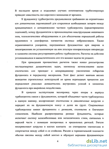 Актуальность исследований. Фундамент турбоагрегата (ФТА) -строительная конструкция, обеспечивающая стабильность положения турбоагрегата и низкий уровень вибрации. Наиболее распространены в настоящее время рамные фундаменты, представляющие собой опорную платформу, опирающуюся на систему пружинной виброизоляции или на гибкие стойки, заделанные в массивную нижнюю плиту. Воспринимаемые фундаментом динамические нагрузки могут носить установившийся или нестационарный временной характер. К последним относятся нагрузки, возникающие при авариях на турбине, генераторе или при сейсмических воздействиях. Традиционно при расчетах фундаментов эти нагрузки преобразуются в эквивалентные квазистатические силы с использованием больших значений коэффициентов запаса. Однако, такой подход не решает следующих вопросов: определение инерционных нагрузок на расположенные на фундаменте оборудование и аппаратуру, определение максимальных динамических перемещений для проверки сохранения требуемых зазоров между фундаментом и примыкающими строительными конструкциями и для обеспечения нормальной работы системы виброизоляции. Кроме того, использование квазистатических сил в прочностных расчетах приводит к неоправданному увеличению габаритов фундамента и перерасходу материалов.