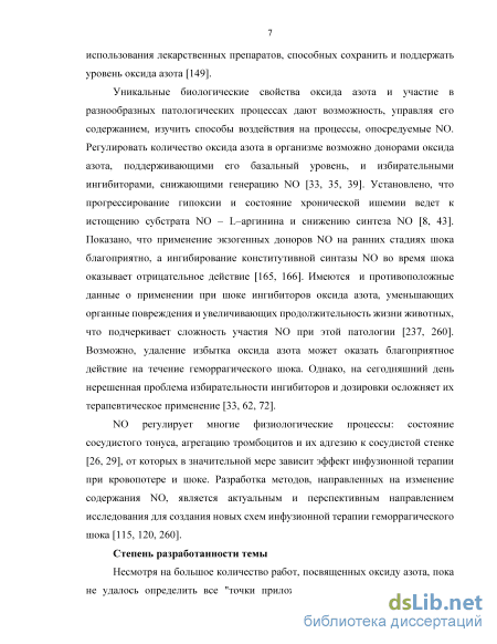 Анализ приведенных литературных данных показывает, что, несмотря на большое число исследований, посвященных патогенетической роли оксида азота, пока не удалось определить все "точки приложения" NО. Многие свойства оксида азота продолжают изучаться фармакологами, медиками различных специальностей. Говоря о значении NO при ГШ, трудно найти ту грань, которая определяет цитозащитную и цитотоксическую роль NO. Снижение активности эндотелиальной конститутивной синтазы приводит к нарастанию эндогенной недостаточности NO, ухудшению коронарной гемодинамики и кровотока в венозном русле [35, 211], а избыточное количество может привести к ишемии органов и ткани. С другой стороны, не надо забывать, что NO улучшает микроциркуляцию и тканевую перфузию и поэтому полностью подавлять продукцию оксида азота нельзя. Кроме того, на сегодняшний день практически нет сведений о влиянии регуляторов синтеза оксида азота, применяемых вместе с инфузионными средами, восполняющими кровопотерю при геморрагическом шоке. Таким образом, проблема повышения эффективности инфузионной терапии геморрагического шока актуальна и по сей день. Представляется перспективным исследование роли оксида азота как одного из потенциальных регуляторов cосудистого тонуса при инфузионной терапии ГШ. Есть основание полагать, что направленное воздействие на метаболизм оксида азота с помощью доноров NO и ингибиторов NO-синтаз позволит расширить возможности инфузионной терапии ГШ и явится новым подходом в лечении нарушений кровообращения при шоке.