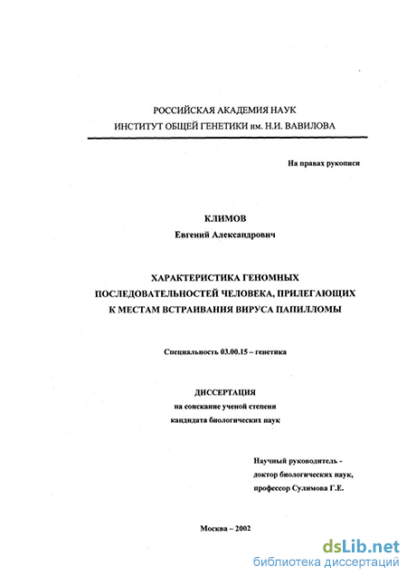 Климов Евгений Александрович. Характеристика геномных последовательностей человека, прилегающих к местам встраивания вируса папилломы : диссертация ... кандидата биологических наук : 03.00.15.- Москва, 2002.- 115 с.: ил. РГБ ОД, 61 03-3/279-5