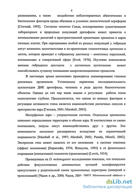 В настоящее время интенсивно проводится секвенирование геномов различных организмов. Установлена первичная последовательность нуклеотидов ДНК дрозофилы, человека и ряда других биологических объектов. Однако до сих пор наши знания о регуляции работы генов недостаточно глубоки. Предполагается, что одним из важных факторов в регуляции активности генов является взаимодействие различных локусов в пространстве ядра [Гвоздев, 2001; Marshall, 2003]. Экспрессия гена может зависеть от его положения в системе генотипа (эффект положения) [Бир-штейн, 1976; Жимулев, 1993] и от физического спаривания (конъюгации) гомологов (трансвекция) [Lewis, 1954]. Исследование влияния перестановки генетического материала на проявление генов дрозофилы является актуальным, поскольку может приблизить нас к пониманию того, как осуществляется контроль экспрессии.