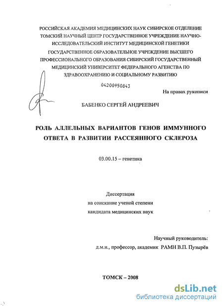 1. Полиморфные варианты VNTRIL1RN, АГ188СIL12B, G(-308)A TNFA и T/t VDR являются одними из факторов риска развития рассеянного склероза у русских; маркеры G(-308)A гена TNFA и T/t гена VDR ассоциированы с PC только в группе мужчин, а маркер А1188С гена IL12B — только в группе женщин. Полиморфные варианты Al 188С1Ы2В и G(-308)A TNFA ассоциированы с показателями клинического течения PC (продолжительность первой ремиссии, степень инвалидизации) и параметрами, характеризующими воспалительный процесс при заболевании (IgG, IgM, СОЭ); с показателями воспаления также ассоциированы варианты VNTR IL1RN (IgG), С27250ТIL12RB1 (IgA, IgM, количество моноцитов), F/fn B/b VDR (IgG, СОЭ, количество CD 16+ клеток); полиморфный маркер T/t VDR ассоциирован с количественными признаками, характеризующими воспаление (количество HLA-DR+ клеток), цитотоксичность (количество эозинофилов, показатели НСТ-теста) и апоптоз (количество CD95+ клеток) при рассеянном склерозе. 3. Носители гаплотипа Bft гена VDR имеют повышенный риск развития PC. Апробация работы;