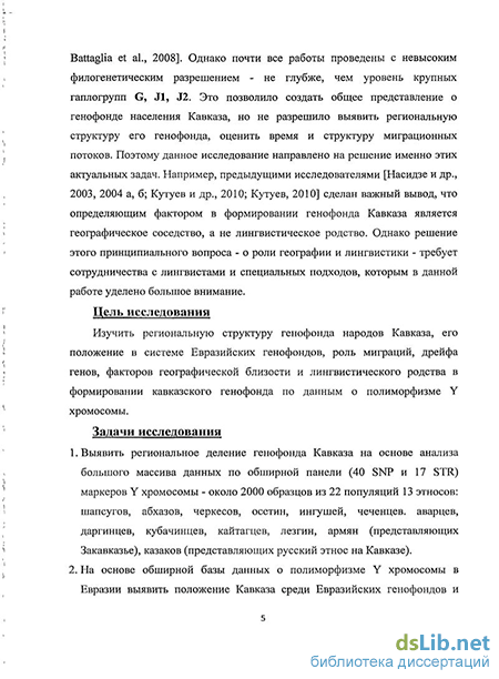 Исследования изменчивости Y хромосомы в населении Кавказа проведены рядом авторов - И. Насидзе (Nasidze et al., 2003; 2004 и др.), К.Б. Булаевой (совместно с университетом Pisa, Италия) ( et al., 2009; Caciagli et al., 2009; Bulayeva et al., 2006, 2007 и др.), научного коллектива под руководством Э.К. Хуснутдиновой (Юнусбаев, 2006; Литвинов, 2009; Боготова, 2009; Кутуев и др., 2010; Кутуев, 2010). Данные по отдельным кавказским популяциям появлялись в статьях, посвященных изучению Y хромосомы в масштабе целых континентов (Semino et al., 2000, 2004; Wells et al., 2001; Cinnioglu et al., 2003; Di Giaсomo et al., 2004; Cruciani et al., 2007; Battaglia et al., 2008). Однако почти все работы проведены с невысоким филогенетическим разрешением - не глубже, чем уровень крупных гаплогрупп G, J1, J2. Это позволило создать общее представление о генофонде населения Кавказа, но не разрешило выявить региональную структуру его генофонда, оценить время и структуру миграционных потоков. Поэтому данное исследование направлено на решение именно этих актуальных задач. Например, предыдущими исследователями (Насидзе и др.., 2003, 2004 а, б; Кутуев и др., 2010; Кутуев, 2010) сделан важный вывод, что определяющим фактором в формировании генофонда Кавказа является географическое соседство, а не лингвистическое родство. Однако решение этого принципиального вопроса - о роли географии и лингвистики - требует сотрудничества с лингвистами и специальных подходов, которым в данной работе уделено большое внимание.