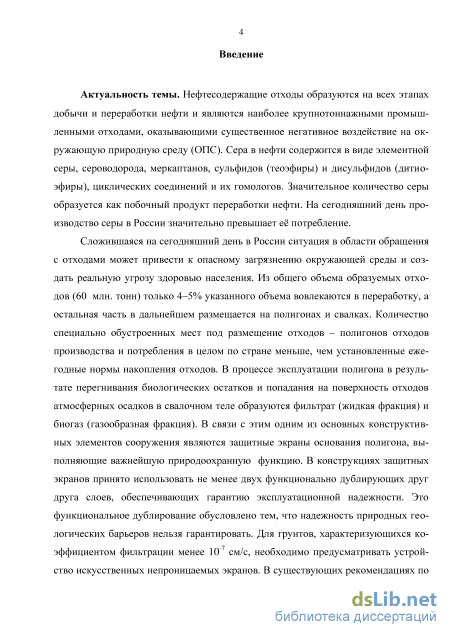 При сжигании попутных нефтяных газов, в результате дегазации нефти и пластовых вод образуется оксид углерода. Высокие концентрации СО в воздухе вызывают обильное слезотечение, удушье, головокружение, боли в желудке. Диоксид углерода поступает в атмосферу за счет сжигания топлива, дегазации нефти и пластовых вод, при концентрации в воздухе 4-5% оказывает раздражающее действие, при концентрации 10% вызывает сильное отравление. Сера входит в очень агрессивные соединения (сера, сероводород и меркаптаны), приводящие к коррозии металла и ухудшающие антидетонационные свойства топлив и качество вторичных продуктов переработки нефти. Сернистые соединения выделяются из сернистой нефти, природного газа, конденсата и также являются токсичными веществами. Сера, при термическом воздействии на нефть, образует сероводород. Остаточная сера объединяет те соединения, которые при температурной обработке не вступают в реакцию. Меркаптаны - высокотоксичные органические серосодержащие газы, обнаруживаются в воздухе нефтепромыслов. Легко проникают через кожу, вызывая тошноту и головную боль. Сероводород - бесцветный ядови-тый газ, ощущаемый при небольших концентрациях 1,5-2 мг/м . Предельно допустимая концентрация (ПДК) сероводорода в воздухе рабочей зоны составляет 3 мг/м , при концентрации 1000 мг/м наступает мгновенная смерть. Еще один бесцветный токсичный газ, присутствующей в атмосфере на нефтепромыслах -сернистый ангидрид. При длительном воздействии на человека вызывает хроническое отравление, поражение печени, кровеносной системы и развитие пнев-москлероза. При содержании этого газа в воздухе свыше 300 мг/м происходит потеря сознания. Двуокись азота представляет собой бурый газ с удушливым запахом, оказывает токсическое воздействие на легочную систему, провоцируя развитие бронхита, эмфиземы легких, астмы. При неполном сгорании или термическом разложении углеродистых веществ образуется сажа. Содержание сажи в воздухе более 8% позволяет рассматривать её как взрывоопасное вещество. Бен-запирен (и другие ароматические полициклические углеводороды) содержится в нефти и природных битумах и представляет собой канцероген первого класса опасности. Может проникать через кожу и органы дыхания. Синтетические поверхностно-активные вещества (ПАВ) являются распространенным и токсичным загрязнителем вод при бурении скважин, сборе и транспортировке нефти. Сульфатное и хлоридное загрязнение - один из наиболее часто встречающихся видов загрязнения гидросферы нефтепромыслов. При утечках нефти и пластовой воды выводятся из хозяйственного использования поверхностные, подземные воды и почвенный покров. Прорыв трубопроводов, разливы нефти также наносят серьезный ущерб окружающей среде [24]. Для снижения техногенного воздействия на почву проводятся мероприятия, направленные на сокращение образования отходов нефтедобычи и увеличение объемов их утилизации; утилизацию накопленных и безопасное хранение вновь образующихся отходов; разработку и реализацию программ строительства сети полигонов по утилизации нефтешламов [1, 17, 65].