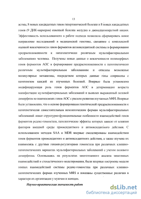 кандидатных генов (9 ДНК-маркеров) язвенной болезни желудка и двенадцатиперстной кишки. Эффективность использованного в работе подхода позволила сформировать новое направление исследований в медицинской генетике, связанное с комплексной оценкой вовлеченности генов ферментов антиоксидантной системы в формировании предрасположенности к патогенетически различным мультифакториальным заболеваниям человека. Получены новые данные о вовлеченности полиморфных генов ферментов АОС в формирование предрасположенности к патогенетически различным мультифакториальным заболеваниям и описаны конкретные молекулярные механизмы, посредством которых данные гены сопряжены с патогенезом каждой из изученных болезней. Впервые была установлена модифицирующая роль генов ферментов АОС в детерминации возраста манифестации мультифакториальных заболеваний и выявлен выраженный половой диморфизм во взаимосвязях генов АОС с риском развития изучаемых МФЗ. Впервые было установлено, что в основе формирования генетической предрасположенности к патогенетически самостоятельным нозологическим формам мультифакториальных заболеваний лежат структурно-функциональные особенности организации генной сети ферментов редокс-гомеостаза, патологические эффекты которой зависят от влияния факторов внешней среды прооксидантного и антиоксидантного действия. С использованием методов SAA и MDR впервые смоделированы взаимодействия генов ферментов прооксидантого и антиоксидантного действия, а также изучена их взаимосвязь с другими генами-регуляторами гомеостаза при различных клинико-патогенетических вариантах мультифакториальных заболеваний с учетом полового диморфизма. Основываясь на результатах многоэтапного анализа межгенных взаимодействий и стохастического моделирования, были впервые реконструированы модели генной сети редокс-гомеостаза при различных клинико-патогенетических формах изученных МФЗ и показаны существенные различия в характере их организации у мужчин и женщин.