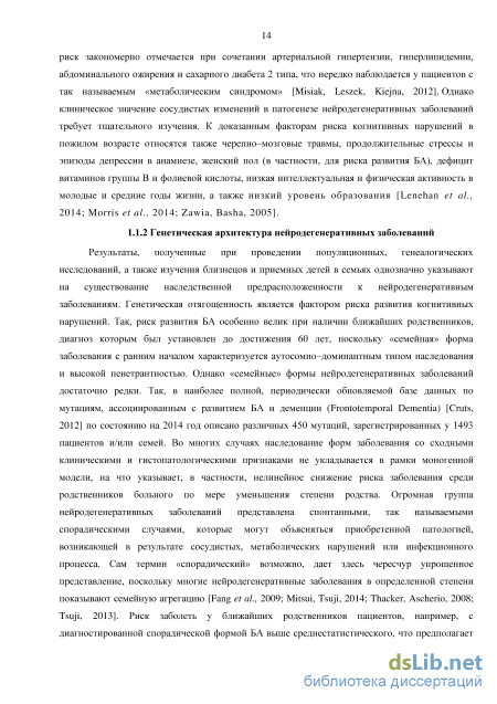 Результаты, полученные при проведении популяционных, генеалогических исследований, а также изучения близнецов и приемных детей в семьях однозначно указывают на существование наследственной предрасположенности к нейродегенеративным заболеваниям. Генетическая отягощенность является фактором риска развития когнитивных достаточно редки. Так, в наиболее полной, периодически обновляемой базе данных по мутациям, ассоциированным с развитием БА и деменции (Frontotemporal Dementia) [Cruts, 2012] по состоянию на 2014 год описано различных 450 мутаций, зарегистрированных у 1493 пациентов и/или семей. Во многих случаях наследование форм заболевания со сходными клиническими и гистопатологическими признаками не укладывается в рамки моногенной модели, на что указывает, в частности, нелинейное снижение риска заболевания среди родственников больного по мере уменьшения степени родства. Огромная группа нейродегенеративных заболеваний представлена спонтанными, так называемыми спорадическими случаями, которые могут объясняться приобретенной патологией, возникающей в результате сосудистых, метаболических нарушений или инфекционного процесса. Сам термин «спорадический» возможно, дает здесь чересчур упрощенное представление, поскольку многие нейродегенеративные заболевания в определенной степени показывают семейную агрегацию [Fang et ah, 2009; Mitsui, Tsuji, 2014; Thacker, Ascherio, 2008; Tsuji, 2013]. Риск заболеть у ближайших родственников пациентов, например, с диагностированной спорадической формой БА выше среднестатистического, что предполагает вклад генетических факторов в патогенез спорадических форм нейродегенеративных заболеваний.