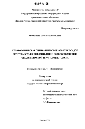 Диссертация выполнена на кафедре инженерной геологии и геоэкологии Томского государственного архитектурно-строительного университета.