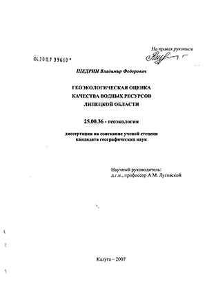 региональные закономерности формирования качества водных ресурсов на территории Липецкой области в условиях интенсивного антропогенного воздействия,