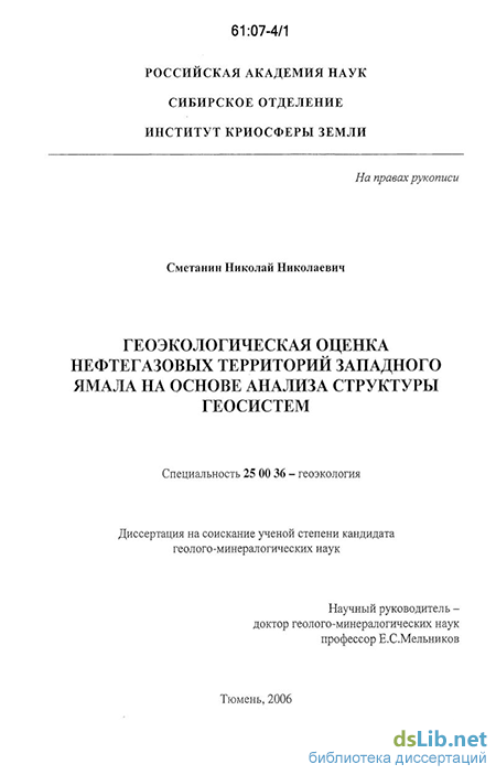 Объектом геоэкологической оценки является состояние геосистем, или отдельных их параметров. В работе, под состоянием какой-либо геосистемы мы понимаем ее структуру, комплекс свойственных ей криогенных процессов, а также почвенно-растительный покров, как естественную базу для восстановления после нарушения. Соответственно, предметом оценки являются ландшафтная структура территории, инженер но-геокриологические условия, разнообразие криогенных процессов и почвенно-растительный покров геосистем.