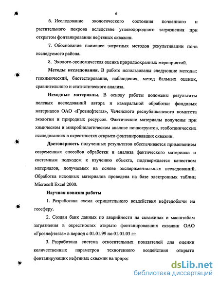 Теоретическая ценность работы заключается в методическом подходе, направленном на обоснование необходимости применения методики геоэкологической оценки влияния открытого фонтанирования нефтяных скважин на компоненты геосферы; высокого потенциала как черноземных почв предгорной степной зоны, так и природно-климатических условий района исследований, что позволяет использовать наименее затратные методы рекультивации нефтезагрязненных земель.