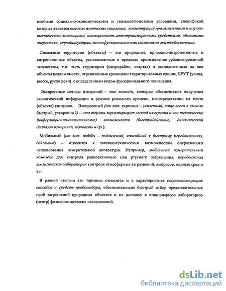 обнаружение точечных источников загрязнения, контроль состояния жилых и производственных помещений, прилегающих к ним территорий). Поэтому создание эффективных систем контроля локальных территорий и объектов является чрезвычайно актуальной экологической проблемой промышленно-урбанизированных территорий и требует совершенствования, как общих методологических подходов, так и соответствующих аппаратурно-методических средств, базирующихся на экспрессных методах экологических измерений.