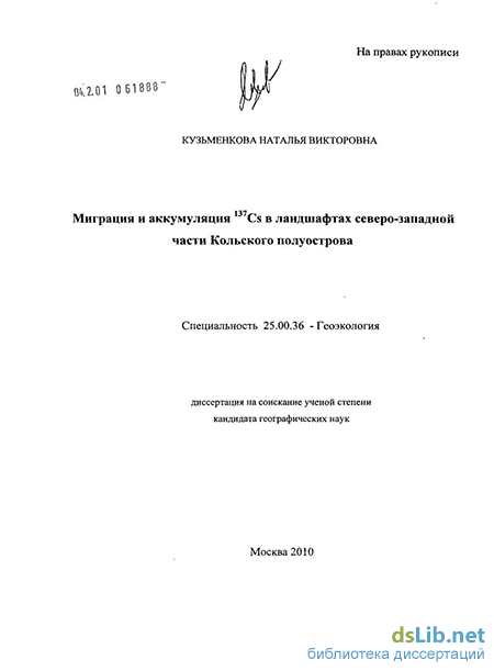 Научная новизна. В работе решена важная научная задача - определены особенности миграции и концентрации 137Cs в специфических южно-тундровых ландшафтах северо-западной части Кольского полуострова, имеющая большое значение для геоэкологии. Составлена крупномасштабная карта элементарных ландшафтов на территорию исследования. Впервые созданы карты удельных активностей радионуклидов в зоне влияния СРЗ «Нерпа», отражающая особенности пространственного распространения 137Cs, и карта радиационного загрязнения территории. Рассчитаны фоновые содержания радионуклидов для подбуров, подзолов, глееземов и лишайников рода Cladonia и Cetraha северо-западной части Кольского полуострова. Изучены формы содержания 137Cs в вертикальном профиле основных типов почв исследуемой территории. Впервые исследованы латеральная и радиальная миграция 137Cs в геохимических ландшафтах в условиях мелкосопочника северо-западного побережья Кольского залива. Дана оценка влияния радиационно-опасного предприятия СРЗ «Нерпа» на почвы и лишайники.