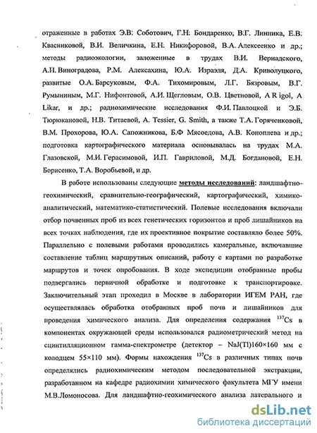 Методологической базой исследований являются ландшафтно-геохимические принципы, разработанные А.И. Перельманом, М.А. Глазовской, Н.С. Касимовым; методы изучения миграции и аккумуляции радионуклидов, отраженные в работах Э.В. Соботович, Г.Н. Бондаренко, В.Г. Линника, Е.В. Квасниковой, В.И. Величкина, Е.Н. Никифоровой, В.А. Алексеенко и др.; методы радиоэкологии, заложенные в трудах В.И. Вернадского, А.П. Виноградова, P.M. Алексахина, Ю.А. Израэля, Д.А. Криволуцкого, развитые О.А. Барсуковым, Ф.А. Тихомировым, Л.Г. Бязровым, В.Г. Румыниным, М.Г. Нифонтовой, А.И. Щегловым, О.В. Цветновои, A Rigol, A Likar, и др.; радиохимические исследования Ф.И. Павлоцкои и Э.Б. Тюрюкановои, Н.В. Титаевои, A. Tessier, G. Smith, а также Т.А. Горяченковой, В.М. Прохорова, Ю.А. Сапожникова, Б.Ф Мясоедова, А.В. Коноплева и др.; подготовка картографического материала основывалась на трудах М.А. Глазовской, М.И. Герасимовой, И.П. Гавриловой, М.Д. Богдановой, Е.Н. Борисенко, Т.А. Воробьевой, и др.