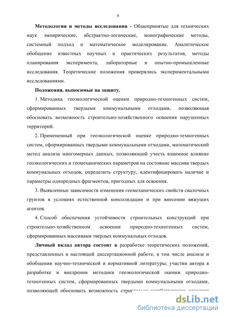 Личный вклад соискателя состоит в разработке теоретических положений, представленных в настоящей диссертационной работе, в том числе анализе и обобщении научно-технической и нормативной литературы; участии автора в разработке и внедрении методики геоэкологической оценки природно-техногенных систем, сформированных твердыми коммунальными отходами, позволяющей обосновать возможность строительно-хозяйственного освоения нарушенных территорий; применении математического метода анализа многомерных как инструмента оценки массива твердых коммунальных отходов; в подготовке и проведении экспериментов, направленных на изучение геомеханических свойств свалочных грунтов в условиях естественной консолидации и при внесении вяжущих; разработке способа обеспечения устойчивости строительных конструкций при освоении природно-техногенных систем, сформированных массивами коммунальных отходов; подготовке публикаций по материалам диссертационной работы.
