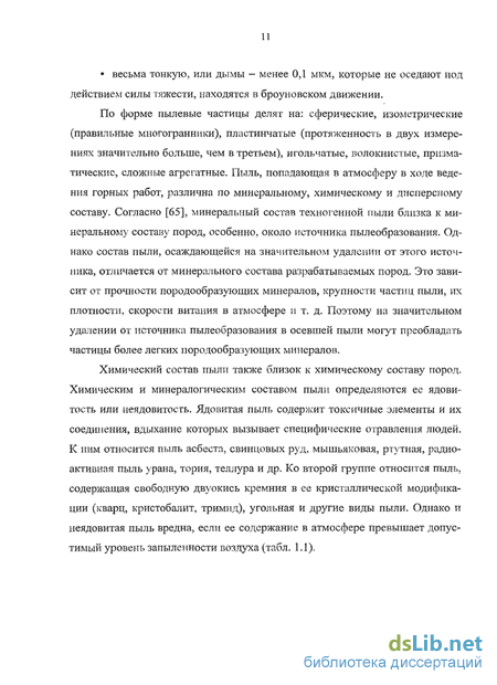 По форме пылевые частицы делят на: сферические, изометрические (правильные многогранники), пластинчатые (протяженность в двух измерениях значительно больше, чем в третьем), игольчатые, волокнистые, призматические, сложные агрегатные. Пыль, попадающая в атмосферу в ходе ведения горных работ, различна по минеральному, химическому и дисперсному составу. Согласно [65], минеральный состав техногенной пыли близка к минеральному составу пород, особенно, около источника пылеобразования. Однако состав пыли, осаждающейся на значительном удалении от этого источника, отличается от минерального состава разрабатываемых пород. Это зависит от прочности породообразующих минералов, крупности частиц пыли, их плотности, скорости витания в атмосфере и т. д. Поэтому на значительном удалении от источника пылеобразования в осевшей пыли могут преобладать частицы более легких породообразующих минералов.
