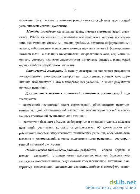 Методы исследования: аналитические, методы математической статистики. Работа выполнена с использованием комплекса методов исследований, включающих системный анализ проблемы, патентно-информационный анализ, лабораторные и натурные методы изучения условий формирования потоков пыли на пылящих поверхностях, микроскопический, седиментацион-ный, ситовой, анализы дисперсности материала, физико-механическую оценку свойств получаемого покрытия.