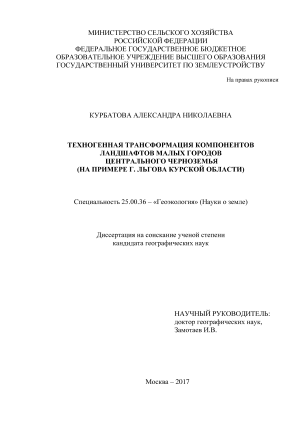 Цель работы – установить закономерности техногенной трансформации компонентов ландшафтов г. Льгова и оценить их эколого-геохимическое состояние.