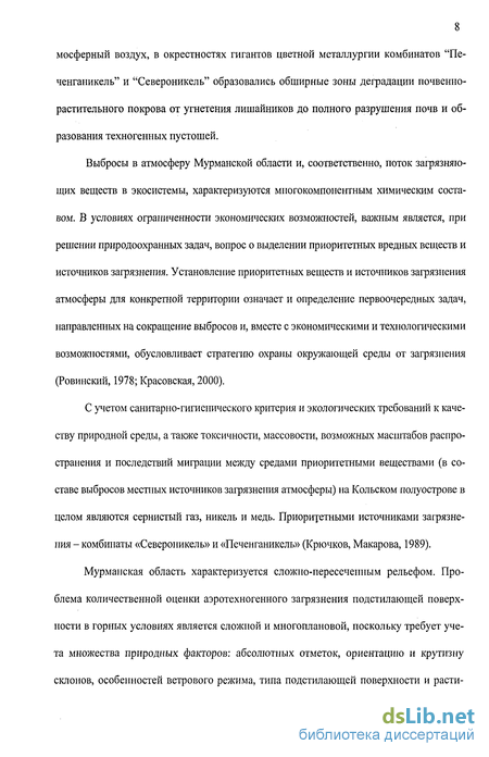 Наличие на территории Кольского полуострова большого количества предприятий по добыче и переработке полезных ископаемых, обусловливает исключительно высокую антропогенную нагрузку на природные ландшафты ряда районов, особенно тех, к которым относятся горно-металлургические центры Мурманской области. В результате большого количества выбросов сернистого газа и тяжелых металлов в ат мосферный воздух, в окрестностях гигантов цветной металлургии комбинатов "Пе-ченганикель" и "Североникель" образовались обширные зоны деградации почвенно-растительного покрова от угнетения лишайников до полного разрушения почв и образования техногенных пустошей.