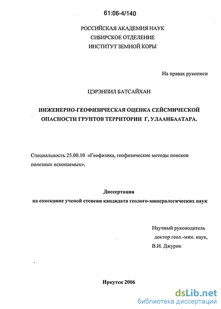 Фактический материал. По теме диссертации использован фактический материал, полученный автором или при его участии при проведении электроразведочных и сейсмораз водочных измерений на территории г. Улаанбаатар (около 300 зондирований). Использованы данные вибрационной сейсмики, выполненные ранее институтом геофизики СО РАН по трем профилям протяженностью от 600 до 3000 м. Результаты их переинтерпретация, выполненные диссертантом, с применением современных программ и с учетом решения поставленных задач. Записи слабых землетрясений региональной сетью по трем сейсмостанциям в радиусе 60 км от центра города за последние 5 лет, диссертант является ответственным исполнителем работ по этой сети. Данные ультразвуковых измерений на образцах коренных пород (около 600) отобранных из обнажений в районе города. Результаты геофизических измерений, полученные в 2001-2004 гг. при обосновании инженерно-сейсмологических условий строительства на трех участках в пределах города (Голомт, зона строительства дома отдыха в районе аэропорта и 3-й микрорайон). Использовались также фондовые и архивные материалы по инженерной геологии и гидрогеологии территории города.