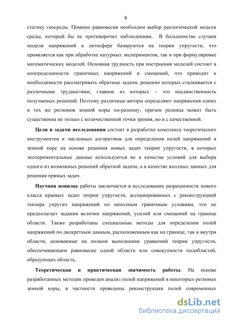 Исследования напряженного состояния в земной коре представляют несомненный интерес для описания таких глобальных явлений, как движения тектонических плит или подвижек по геологическим нарушениям, приводящим к землетрясениям. С другой стороны, знание современных напряжений важно для инженеров, работающих в горном деле, нефтегазовой промышленности или занятых проектированием и эксплуатацией различных подземных сооружений. Именно задача определения полей напряжений в земной коре и дала главный импульс для написания данной диссертации, нацеленной на разработку математических методов реконструкции напряжений по экспериментальным данным. Однако геомеханика не является единственной областью, в которой могут быть использованы результаты этой работы. Они могут оказаться полезными в ситуациях, когда прямые измерения характеристик напряженно-деформированного состояния среды либо принципиально невозможны, либо осложнены влиянием измерительных инструментов, в то время как некоторые косвенные данные могут быть доступны для интерпретации. Также следует отметить и новые постановки плоской краевой задачи теории упругости, которые представляют самостоятельный интерес, как дополнение к исследованным ранее краевым задачам.