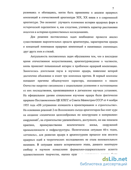 Актуальность поставленных задач обусловлена тем, что в последнее время отечественное искусствознание, архитектуроведение в частности, вновь проявляет повышенный интерес к проблемам ордерной композиции. Закончилась длительная пауза в изучении ордера, появление которой достаточно объяснимо и имеет три комплекса причин. В первый комплекс попадают причины общенаучного характера, оказавшиеся в нашем Отечестве накрепко связанными с социальными условиями и вытекающими из них последствиями, проявлявшимися в догматизме научных установок. На официальном уровне специальное изучение ордера было фактически прервано Постановлением ЦК КПСС и Совета Министров СССР от 4 ноября 1955 года «Об устранении излишеств в проектировании и строительстве». На основании решений 2-го Всесоюзного съезда архитекторов был взят курс на создание «технически целесообразных по конструкции и материалам» сооружений1, на строительство удешевлённого, доступного, но как показала практика, преимущественно неэстетичного жилья, сооружений промышленности и инфраструктуры. Политическая ситуация 60-х годов, «оттепель», для развития ордера в архитектурном процессе или анализа ордерных идей в теоретических исследованиях не стала положительным явлением. В ситуации нового исторического этапа, давшего некоторую свободу в научном осмыслении формально-содержательного аспекта художественного творчества, оценка ордера в культурном смысле была