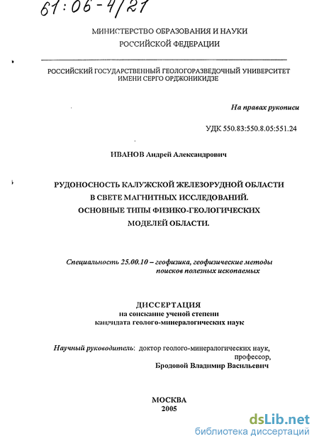 2) комплексирования магнитной съемки с наземными гравиметрическими маршрутами для подтверждения рудной природы аномалий, электрическим зондированием ЗСБ и 43, сейсморазведки для уточнения структурных условий района, с бурением проверочных поисковых скважин с комплексом каротажа (ПС, КС, МСК, ГК, АК) и скважинной геофизики (ТСМ, РВП и МЭК) для изучения разреза скважин и околоскважинного пространства. Новизна работы заключается в том, что по результатам работ МГГРУ (под руководством Бродового В.В., Иванова А.А.) и участием сотрудников МГУ и МГГРУ, а также студентов МГГРУ, выявлена новая железорудная область -Калужская, являющаяся северным флангом (фрагментом) Курской магнитной аномалии, в составе трех железорудных районов: Северного Калужского, Северовосточного Калужского и Юго-западного Калужского. Рудная область КМА этими работами прослежена на север от ее северного фланга на расстояние около 150 км. Определены типы железорудных узлов: грабен-синклинальный, троговый и синклинально-горловинный.