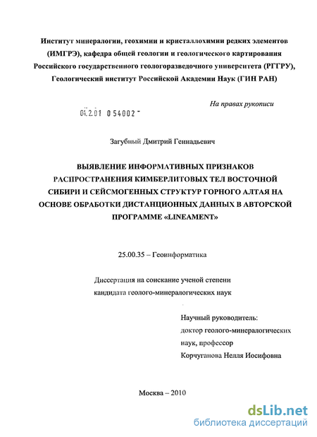 Структура и объели Диссертация состоит из 5 глав, введения и заключения общим объемом 185 с, содержит 164 рис, в том числе 150 авторских. Список литературы насчитывает 129 литературных источников и 21 интернет-ссылку. Первая глава посвящена краткому обзору данных дистанционного зондирования и программному обеспечению. Во второй главе «Программа Lineament для обработки дистанционных данных» приводится краткое описание разработанной автором программы, рассматриваются основные преобразования и фильтрации, выполняемые с сетками данных, растровыми и векторными материалами, приводится краткое описание поддерживаемых программой Интернет-моделей цифрового рельефа и способов работы с ними. В третьей главе на примере Попигайской структуры рассмотрены возможности программы для поиска и выделения кольцевых структур на основании дешифрирования снимков и цифрового рельефа. В четвертой главе изложены возможности обработки цифрового рельефа с целью изучения новейшего строения системы Чуйско-Курайских впадин и результаты полевых исследований сейсмогенных разломов. В пятой главе рассмотрены вопросы программной реализации оценки информативности признаков, приведены данные использования программы Lineament для оценки информативности исходных данных и результатов дешифрирования относительно площадей проявления кимбер-литового магматизма на территории восточной Сибири, а также дан прогноз россыпной алмазоносное на северо-востоке Сибири.