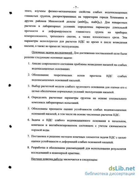 Цель диссертационной работы. Настоящая работа ставит целью разработки метода количественной оценки напряженно - деформированного состояния (НДС) слабых водонасыщенных оснований, взаимодействующих с насыпями в рамках плоской задачи механики грунтов, необходимой для прогнозирования вертикальных и горизонтальных смещений насыпи, а также кратковременной и длительной устойчивости водонасыщенного основания. Для этого, изучены физико-механические свойства слабых водонасыщенных глинистых грунтов, распространенных на территории города Хошимина и других районов Меконгской дельты (ambQrv, mabQiv). Для конкретных расчетов в лабораторных условиях определены параметры длительной прочности и деформируемости глинистого грунта на приборах компрессионного, трехосного сжатия, а также плоскостного среза. Эти параметры используются для расчетов НДС во время и после возведения насыпи, а также во время их эксплуатации.