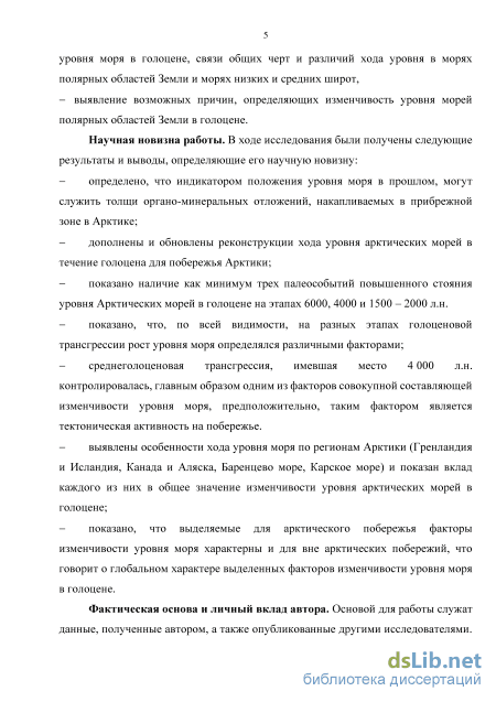Актуальность темы. Актуальность знания о колебаниях уровня моря и их механизмах, прогноза его возможных изменений, совершенно очевидна, т.к. значительная часть человечества живёт на морских и озёрных побережьях, в устьевых областях рек. Побережья подвержены изменениям, часто в нежелательном для человека проявлении. Поэтому выдвинутые в этом исследовании цели и задачи непосредственным образом важны для нормальной жизнедеятельности человека, населяющего прибрежные регионы. Что касается Арктики, то в этом не столь населённом районе колебания уровня моря также чрезвычайно важны, т.к. влияют на хозяйственные объекты и приводят к значительным изменениям побережья. Наряду с геологическим и геокриологическим строением берегов повышение или понижение уровня моря в каждом конкретном регионе приводит к значительным переформированиям берегов, исчезновению значительных площадей суши или образованию новых островов. Имея в виду интерес государства к новому развитию Северного морского пути, а также освоению залежей углеводородов на арктическом шельфе, поставленные цели и задачи исследования имеют не только теоретическое значение, но могут быть использованы для решения прикладных задач рационального природопользования в прибрежных районах российской Арктики, например при строительстве объектов инфраструктуры, обеспечивающей добычу и транспортировку углеводородов. В настоящее время уже ведется добыча углеводородов в Карском море ("Приразломная"), строится порт для погрузки и дальнейшей транспортировки углеводородного сырья, п.Сабета. Развитие арктической зоны Российской Федерации не возможно без освоения, использования и преобразования ее береговой зоны. Изменчивость уровня моря – это важнейший фактор, определяющий развитие береговой зоны в среднесрочной и долгосрочной перспективе. Реконструкция хода уровня моря в прошлом, в течение голоцена является фундаментальной основой для создания прогнозных оценок колебаний уровня моря в будущем, в ближайшие десятки и сотни лет. Для прогнозирования глобального развития окружающей среды требуется не только мониторинг и знание текущих природных процессов, но и понимание масштабов, условий и механизмов прошлых изменений природы.