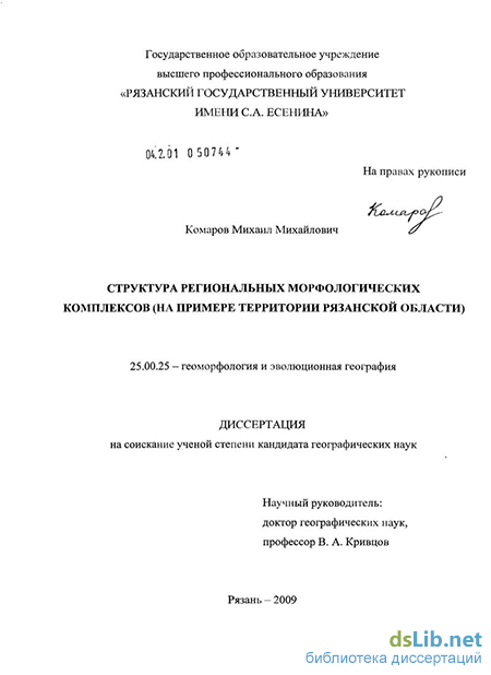 Цель и задачи работы. Целью работы является изучение структуры региональных морфологических комплексов (РМК) на территории Рязанской области для установления их особенностей и условий формирования.