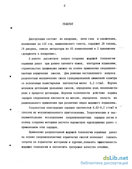 Целью работы является разработка эффективной щадящей технологии взрывных работ при добыче блочного камня, контурном взрывании, строительстве профильных выемок на основе применения сверхнизкоплотных взрывчатых смесей плотностью менее 0,2 г/смЗ.