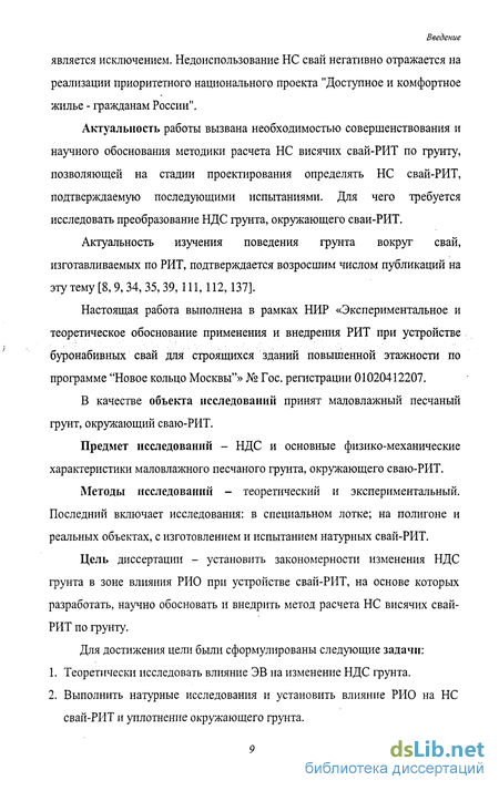 Цель диссертации - установить закономерности изменения НДС грунта в зоне влияния РИО при устройстве свай-РИТ, на основе которых разработать, научно обосновать и внедрить метод расчета НС висячих свай-РИТ по грунту.