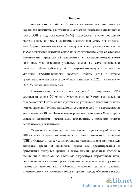 Актуальность работы. В связи с высокими темпами развития народного хозяйства республики Вьетнам (СВР) за последние десятилетия (рост ВВП в год составляет 6-7%) потребность в угле постоянно растет. Угольная промышленность обеспечивает углем для коксования бурно развивающуюся металлургическую промышленность, а также отмечается высокий спрос на энергетические угли со стороны Вьетнамских предприятий энергетики и жилищно-коммунального хозяйства, что позволило угольным компаниям СРВ значительно нарастить объем добычи угля. По перспективному плану развития угольной промышленности годовую добычу угля в стране предусматривается довести до 90 млн.тонн угля в 2025г., в том числе 85-90% подземным способом.