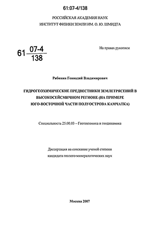 С 1977 г. на Камчатке проводятся непрерывные наблюдения за режимом подземных вод. Одной из важнейших задач гидрогеологического мониторинга являются поиски предвестников землетрясений и оценка сейсмической опасности г. Петропавловск-Камчатский и его окрестностей. Результаты многолетних наблюдений за гидрогеохимическим режимом подземных вод, в целом, совпадают с результатами подобных исследований в других сейсмоопасных регионах. Сюда в первую очередь, относится сам факт обнаружения достоверных предвестниковых эффектов, преимущественно в изменениях макро-компонентного и газового состава подземных вод. С другой стороны, анализ предвестниковых вариаций, зарегистрированных на Камчатке, обнажает общие для разных регионов актуальные проблемы, которые до сих пор не нашли своего решения. В числе таковых, наиболее острыми являются: морфологическое многообразие предвестниковых эффектов; механизмы образования предвестниковых эффектов и зависимость их от региональных и/или местных геолого-гидрогеологических условий; влияние тензочувствительности, которое применительно к гидрогеохимическим системам до сих пор оставалось неизученным; методы идентификации предвестниковых эффектов в сильно нестационарных временных рядах вариаций различных гидрогеохимических показателей.