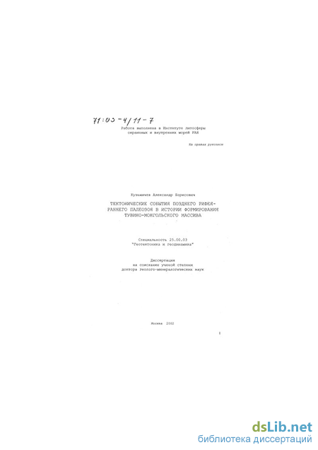 Кузьмичев Александр Борисович. Тектонические события позднего рифея-раннего палеозоя в истории формирования Тувино-Монгольского массива : диссертация ... доктора геолого-минералогических наук : 25.00.03.- Москва, 2002.- 283 с.: ил. РГБ ОД, 71 03-4/11-7