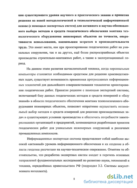 ции существующего уровня научного и практического знания и принятия решения на новой методологической и технологической информационной основе (с помощью экспертных систем) для активного и научно-обоснованного выбора методов и средств геодезического обеспечения монтажа технологического оборудования инженерных объектов по точности, оперативности использования, наименьшим затратам и производительности труда. Это имеет место, как при проектировании геодезических работ на уникальных сооружения, так и на других, ещё более распространённых объектах производства строительно-монтажных работ, а также в эксплуатационный период.
