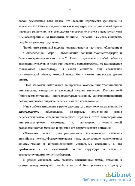 Объектом нашего диссертационного исследования являются английские лексико-фразеологические поля, включающие наименования эпистемических и интенциональных ментальных состояний, а его предметом - их элементный состав, структура и связь с соответствующими концептосферами.