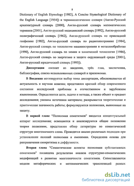Настоящее диссертационное исследование посвящено изучению проблемы полисемии соматизмов, одной из фундаментальных особенностей естественного языка. В работе развитие полисемии рассматривается как детерминированное антрополингвистическими изменениями. Проблематика работы вскрывает корреляцию между концептуальной информацией, передаваемой словом, и эволюцией его лексико-семантической структуры.