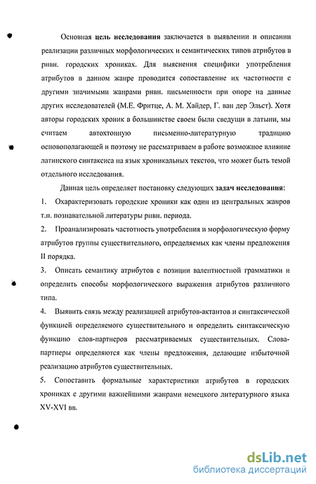 Грамматическому и семантическому анализу атрибутов предпослан анализ городских хроник как типа текста. Мы используем критерии многоуровневой классификации, разработанные В. Хайнеманном и Д. Фивегером [100]. При этом привлекаются работы, посвященные лингвистике текста, в том числе ее историческому аспекту (К. Адамчик [56], К. Бринкер [74], Е. Верлих [172], Е. Гроссе [94], Д. Фивегер [100], Й. Швиталла [156] и др.), а также исследования собственно хроник (Б.Менке [123], Р. Метцлер [125], Ф. Шмале [144; 145], Й. Шмидт [146], Й. Шнайдер [150; 151], К. Шрайнер [155], Р. Шпрандель [162] и др.).