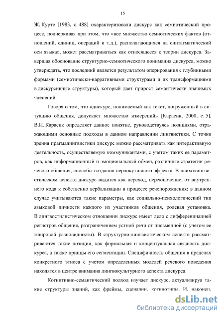 Говоря о том, что «дискурс, понимаемый как текст, погруженный в ситуацию общения, допускает множество измерений» [Карасик, 2000, с. 5], В.И. Карасик определяет данное понятие, руководствуясь позициями, отражающими основные подходы в данном направлении лингвистики. С точки зрения прагмалингвистики дискурс можно рассматривать как интерактивную деятельность, осуществляемую коммуникантами, с учетом таких ее параметров, как информационный и эмоциональный обмен, различные стратегии речевого общения, способы создания перлокутивного эффекта. В психолингвистическом аспекте дискурс видится как переход, переключение, от внутреннего кода к собственно вербализации в процессе речепорождения; в данном случае учитываются такие параметры, как социально-психологический тип языковой личности каждого из участников общения, ролевая установка. В лингвостилистическом отношении дискурс имеет дело с дифференциацией регистров общения, разграничением устной речи от письменной (с учетом ее жанровой разновидности). В структурно-лингвистическом аспекте рассматриваются такие позиции, как формальная и концептуальная связность дискурса, а также принцы его сегментации. Специфичность общения в пределах конкретного этноса с учетом определенных моделей речевого поведения находятся в центре внимания лингвокультурного аспекта дискурса.