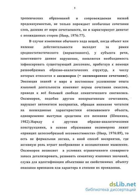 конструкциями, в основе образования оксюморона лежит «принцип целесообразной несовместимости» (Наер, 1976:89), то есть не формальная логика, а иной способ восприятия, где активную роль играет воображение и ассоциативное мышление. Оксюморон позволяет в условиях ограниченного словарного запаса детализировать, развивать семантику языковых значений, служа для идентификации объективно не свойственных объекту описания признаков или характера и степени их проявления.
