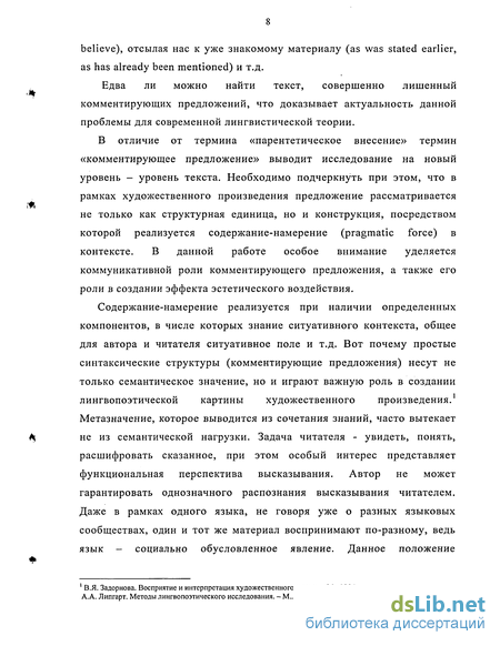 Содержание-намерение реализуется при наличии определенных компонентов, в числе которых знание ситуативного контекста, общее для автора и читателя ситуативное поле и т.д. Вот почему простые синтаксические структуры (комментирующие предложения) несут не только семантическое значение, но и играют важную роль в создании лингвопоэтической картины художественного произведения.1 Метазначение, которое выводится из сочетания знаний, часто вытекает не из семантической нагрузки. Задача читателя - увидеть, понять, расшифровать сказанное, при этом особый интерес представляет функциональная перспектива высказывания. Автор не может гарантировать однозначного распознания высказывания читателем. Даже в рамках одного языка, не говоря уже о разных языковых сообществах, один и тот же материал воспринимают по-разному, ведь язык - социально обусловленное явление. Данное положение