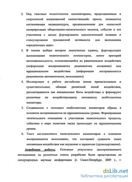 Научная новизна работы заключается в том, что она вносит вклад в разработку теории речевого воздействия, в частности, семантика языковых средств исследуется с позиции прагматического фактора воздействия. Слово рассматривается как ступень в формировании воздействующего потенциала словосочетания, предложения / высказывания, и, далее, через высказывание в формировании функции воздействия основной коммуникативной единицы - текста. Впервые английские прилагательные рассматриваются как инструмент в формировании общего воздействующего эффекта высказываний, составляющих текст политического комментария, который заключается в создании определенной политической пропаганды, лежащей в основе интенции автора.