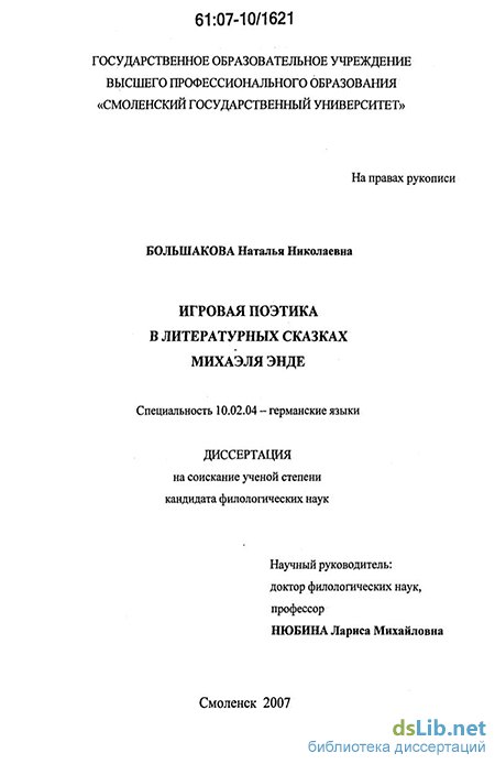 Цель данной диссертации заключается в исследовании игровой поэтики ЛС М. Энде.