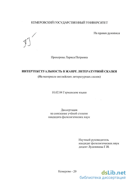 Наши наблюдения показывают, что интертекстуальность английской литературной сказки далеко не ограничивается её связью с фольклорной сказкой, что является традиционным представлением, обусловленным, прежде всего, общим именем «сказка», объединяющим эти жанры. Фольклорная сказка пришла в английскую литературную сказку опосредованно, через западноевропейскую романтическую сказку, сохранившую прототипическую модель жанра.