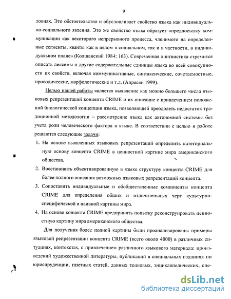 Данное диссертационное исследование посвящено проблемам языковой репрезентации концепта CRIME1 в американском варианте английского языка. Выбор данной темы исследования не случаен. При анализе языковых явлений мы пришли к выводу, что понятие CRIME не стабильно, невозможно дать одно исчерпывающее определение данного феномена. Возникает вопрос: Чем это вызвано? В чем причина неоднозначного определения такого базового понятия, как преступление, не только в юриспруденции, но и в повседневной жизни? Можно ли каким-то образом описать, квалифицировать данное явление с целью решения образовательной задачи, заключающейся в подготовке функционально грамотного специалиста? Проблема определения понятия CRIME носит не узко лингвистический, а прикладной характер, что определило выбор метода исследования, который позволил бы представить картину интересующего нас явления более полно.