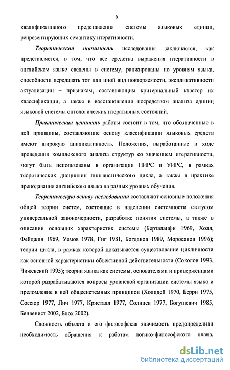 Теоретическая значимость исследования заключайся, как представляется, в том, что все средства выражения итеративности в английском языке сведены в систему, ранжированы по уровням языка, способности передавать тот или иной вид повторяемости, экспликативности актуализации - признакам, составляющим кршериальиый кластер их классификации, а іакже в воссіановлении посредством анализа единиц языковой системы онтологических итеративных состояний.